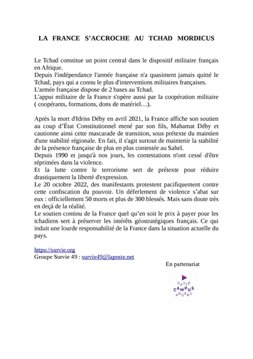 La présence militaire française au Sahel (1 an après la fin de l'opération Barkhane) sera abordée, ainsi que la place particulière du Tchad dans le système françafricain, la situation politique du pays (coup d'état, répression d'octobre 2022 ...), les résistances en cours, etc.