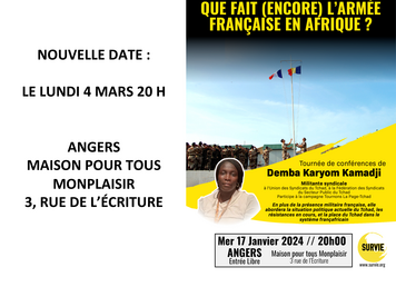Survie49 vous propose cette soirée débat avec la syndicaliste tchadienne Kamadji Demba Karyom. Voir les deux pièces jointes.