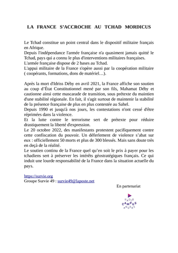 La présence militaire française au Sahel (1 an après la fin de l'opération Barkhane) sera abordée, ainsi que la place particulière du Tchad dans le système françafricain, la situation politique du pays (coup d'état, répression d'octobre 2022 ...), les résistances en cours, etc.